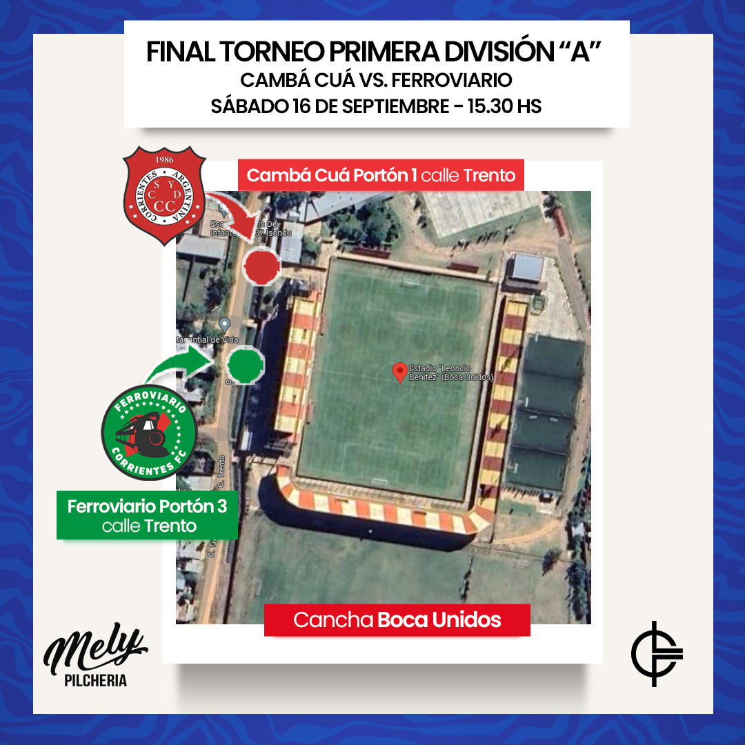 El sábado 16 de septiembre se disputará la final del Torneo Primera División “A” 2023 “Pilchería Mely” de la Liga Correntina de Fútbol (LCF) entre Cambá Cuá y Ferroviario. El encuentro se disputará desde las 15.30 hs. en el estadio del predio “Leoncio Benítez” del club Boca Unidos y en la previa se llevarán a cabo sorteos, regalos y habrá un espectáculo musical.