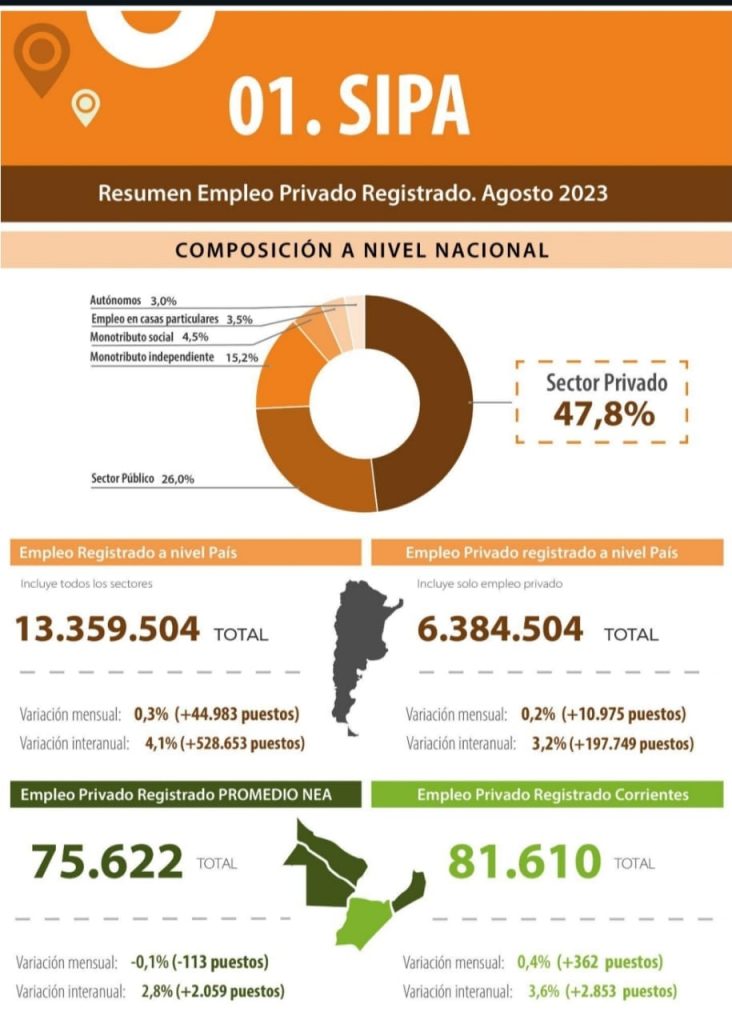 Durante agosto último, el Sistema Integrado Previsional Argentino (SIPA) evidenció 81.610 empleos registrados en el sector privado de Corrientes, sumando 362 puestos más con respecto al mes pasado en la Provincia, siendo la única que mostró datos positivos en el NEA en este periodo. Esto representa un crecimiento del 0,4 %, porcentaje que se eleva a 3,6% si se compara con el mismo mes del año pasado, es decir que la variación interanual indica un crecimiento de 2.853 puestos en este ítem, mostrando así un crecimiento sostenido con un nuevo pico histórico en la materia.