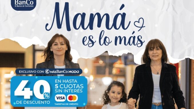“Mamá es lo más” es la nueva campaña del Banco de Corrientes (BanCo) para acompañar a las familias y comerciantes este Día de la Madre, con un descuento del 40% sin tope de reintegro, en hasta cinco cuotas sin interés, abonando exclusivamente a través de MÁSBanCo o MODO. La misma tendrá vigencia desde hoy miércoles 16 hasta el domingo 20 de octubre.