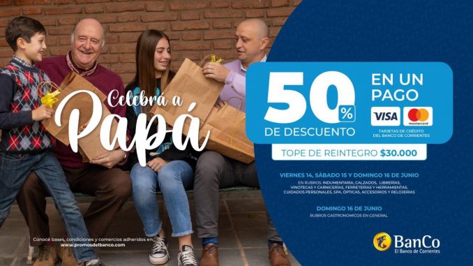 Un año más, el Banco de Corrientes (BanCo) lanza una nueva campaña para acompañar a sus clientes en el Día del Padre. La promoción “Celebrá a papá” brinda un 50% de descuento para compras realizadas con tarjetas de crédito Visa y Mastercard en un pago. Tendrá un tope de reintegro de $30.000 por cuenta.