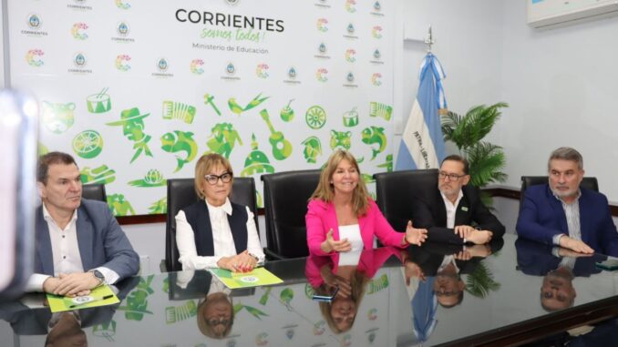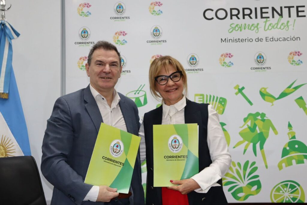 La ministra de Educación, Práxedes López y el interventor de Lotería Correntina, Héctor Javier Bee Sellares, encabezaron esta mañana la firma de un convenio de colaboración entre el Instituto de Loterías y Casinos de Corrientes y la cartera educativa.