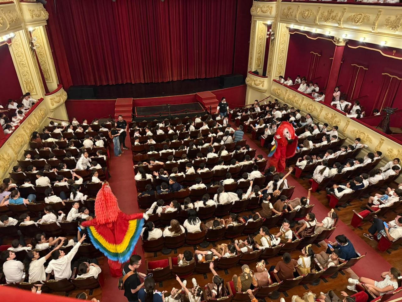 Dos actores caracterizados como Guacamayos rojos gigantes se instalaron a las 9.30 de la mañana de este jueves para recibir a los más de 400 chicos de la escuela Nº1 Manuel Belgrano, más de 100 de la escuela Nº 10 y cerca de 80 de la escuela Normal “Juan Pujol”, quienes fueron especialmente invitados por el Ministerio de Educación para disfrutar de la puesta en escena del musical “Epopeya del Iberá”; en el segundo de tres días de funciones.