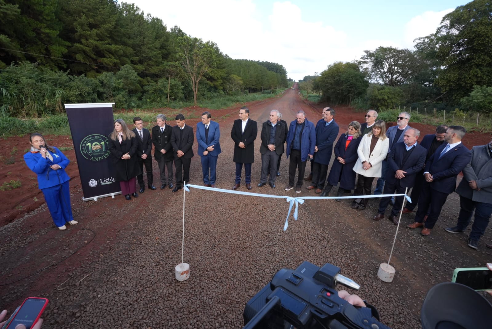 Valdés, después del acto por el aniversario de Liebig y su comitiva se trasladaron hacia las afueras del ejido urbano para inaugurar el enripiado realizado en las rutas provinciales 73 y 74 y en el camino vecinal conocido como “Santa Rosa”. Se trata de 23km intervenidos en tres tramos que beneficiará a toda la zona rural de Liebig. El financiamiento fue posible gracias al Fondo de Desarrollo Rural (FDR) y aportes del Tesoro provincial, con una inversión de 1200 millones de pesos, según explicó el ministro de Producción, Claudio Anselmo.