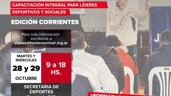 El martes 28 y el miércoles 29 de octubre la Fundación River Plate llega a la ciudad de Corrientes con la “Escuela de Formadores”, una capacitación integral para líderes deportivos y sociales de todas las disciplinas deportivas. La actividad se realizará ambos días, de 9 a 18 hs., en la sede de la Secretaría de Deportes (calle Rivadavia 240) con la colaboración del banco BBVA Francés, la Liga Correntina de Fútbol (LCF), la Federación Correntina de Fútbol (Fecof) y la Secretaría de Deportes del Gobierno de la Provincia de Corrientes.