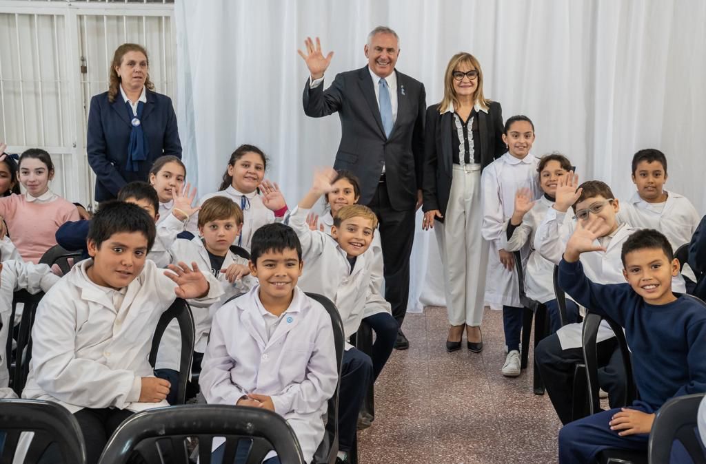 El subsecretario de Gestión Educativa, Julio Navías, presidenta del Consejo General de Educación, Silvina Rollet, directora de la Coordinación de Educación Intercultural Bilingüe, Clarisa Godoy, referente de la Cooperación Internacional Educativa, Sara Lanari, directora de la Escuela N.º 404, Nora Cura, equipos Técnicos del Bilingüe, alumnos, docentes y demás autoridades.