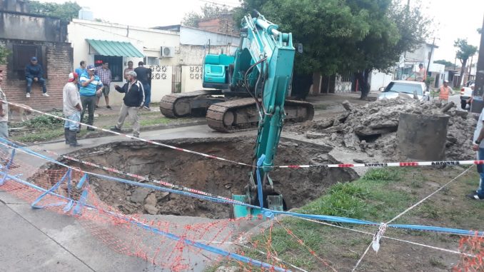 “En el lugar está trabajando una retroexcavadora para retirar el pavimento que cedió y para ver cuáles son las causas del hundimiento, sea la rotura de una de las cañerías de cloaca o el descalce del pluvial que generó que se lave el suelo y haya quedado el pavimento en el aire, y con el camión que pasó por el lugar, se hundió”, precisó.