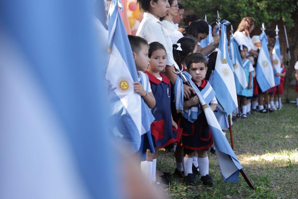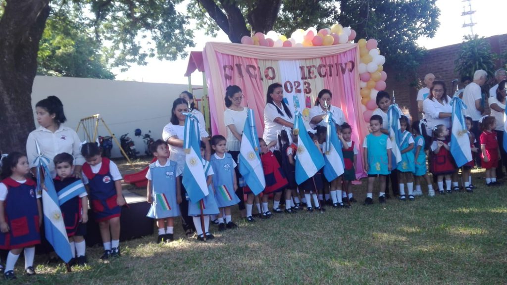Luego del retiro de las banderas, los niños de la sala de 4 años del CDI Ara Pura de ambos turnos cerraron el acto con un chámame El Mamboretá “acompañados del Coro Yasí”.