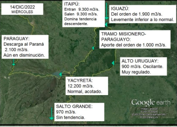 En Yacyretá se registró oscilaciones sobre un caudal medio próximo a 11.800 metros cúbicos por segundo, alejándose de los valores normales para la época. El embalse aún presenta niveles operativos normales, por lo tanto, el derrame hacia el tramo argentino del Río Paraná se encuentra sujeto al caudal de entrada al embalse y al patrón de precipitaciones sobre el área inmediata al mismo, con lo cual, de acuerdo a las lluvias pronosticadas para la próxima semana se espera registrar un leve ascenso si bien este no sería significativo, alcanzaría para sostener un leve ascenso en el tramo argentino del Paraná.