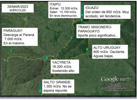 El resumen del informe indica que en el río Paraná, el embalse de Yacyretá continúa con niveles operativos normales, habiendo registrado una erogación semanal promedio próxima a 18.600 metros cúbicos por segundo siendo aproximadamente 4.200 metros cúbicos por segundo superior al valor medio de los últimos 25 años para el mes de marzo. El nivel aguas abajo se mantendría en descenso, oscilante y en rango de aguas medias.