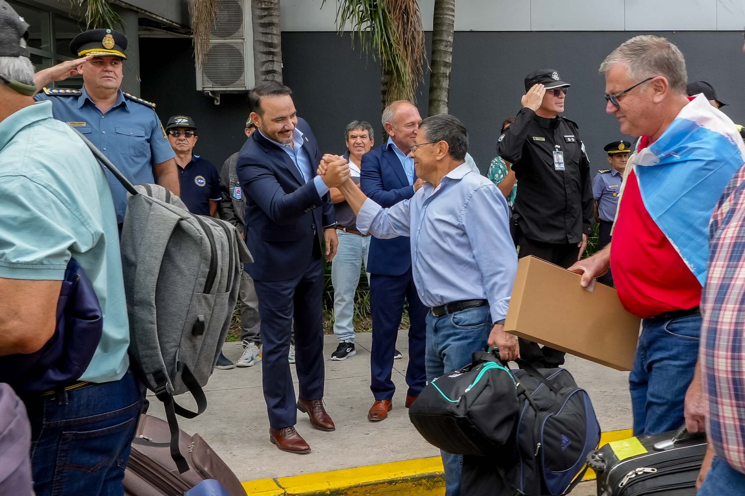 Previamente, alrededor de las 13, la comitiva fue despedida en el aeropuerto por el gobernador Juan Pablo Valdés, quién reconoció a nuestros héroes que lucharon contra el invasor inglés en el conflicto bélico de 1982. «Estamos orgullosos de acompañarlos en este nuevo viaje», fueron las palabras que el mandatario les brindó a los excombatientes previo a un nuevo viaje.