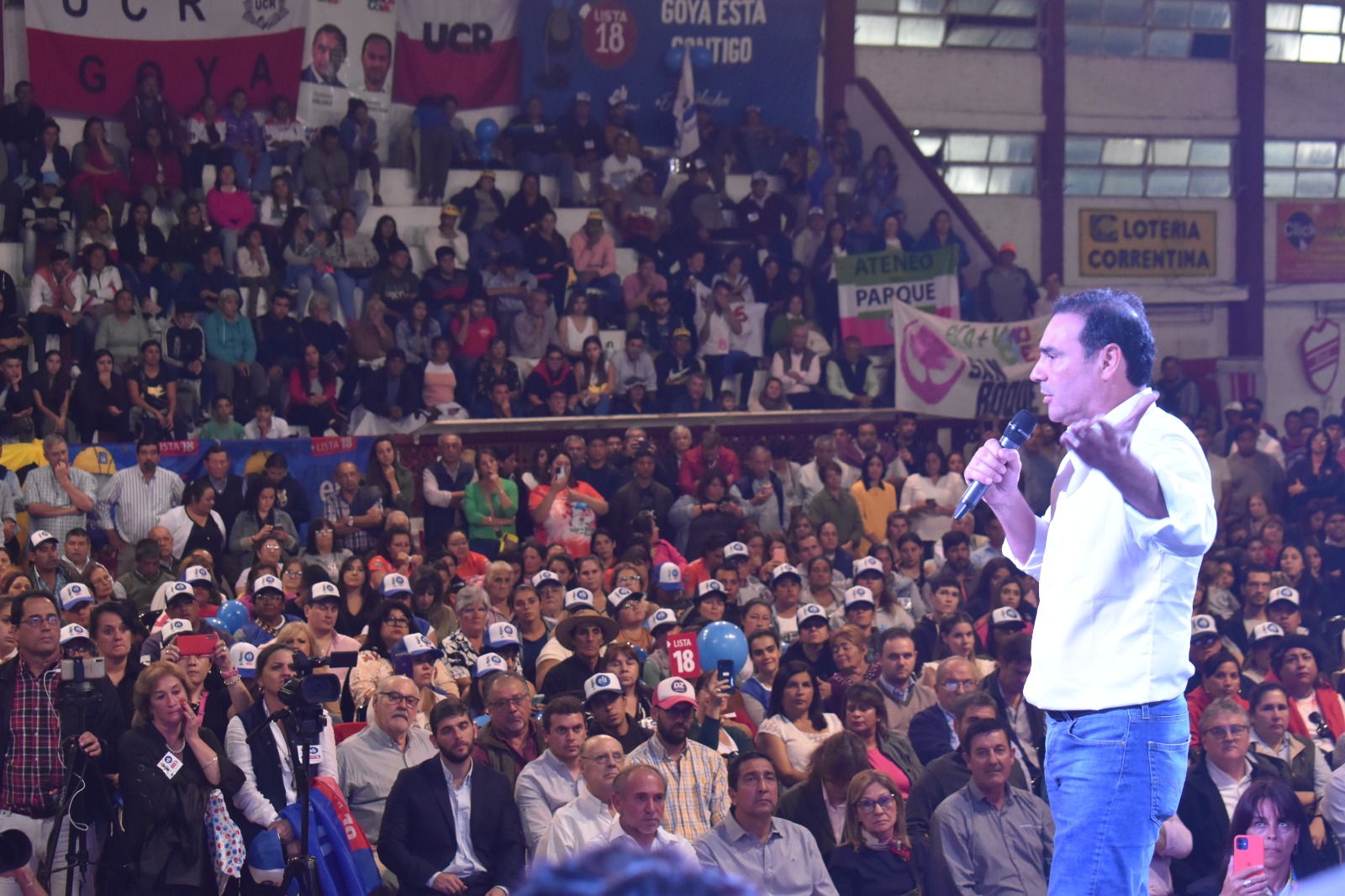 El gobernador Gustavo Valdés encabezó este martes un acto de campaña en la ciudad de Goya, donde sostuvo que la crisis económica del país se debe a la falta de liderazgo en el Gobierno nacional. «Vamos a ganar estas elecciones para cambiar la realidad argentina, porque somos una provincia pacífica y trabajadora, pero que no se deja atropellar», arengó en la ocasión el Mandatario desde el Club Atlético Unión, en el marco de un masivo encuentro de dirigentes de ECO+Vamos Corrientes. Otros oradores allí apuntalaron previamente esta idea, pero consideraron clave obtener un resultado contundente el 11 de junio en las elecciones provinciales para marchar luego hacia una definición nacional que le resulte favorable a la actual gestión provincial y así profundizar los planes de crecimiento y desarrollo que buscan generar una mejor calidad de vida para los correntinos.