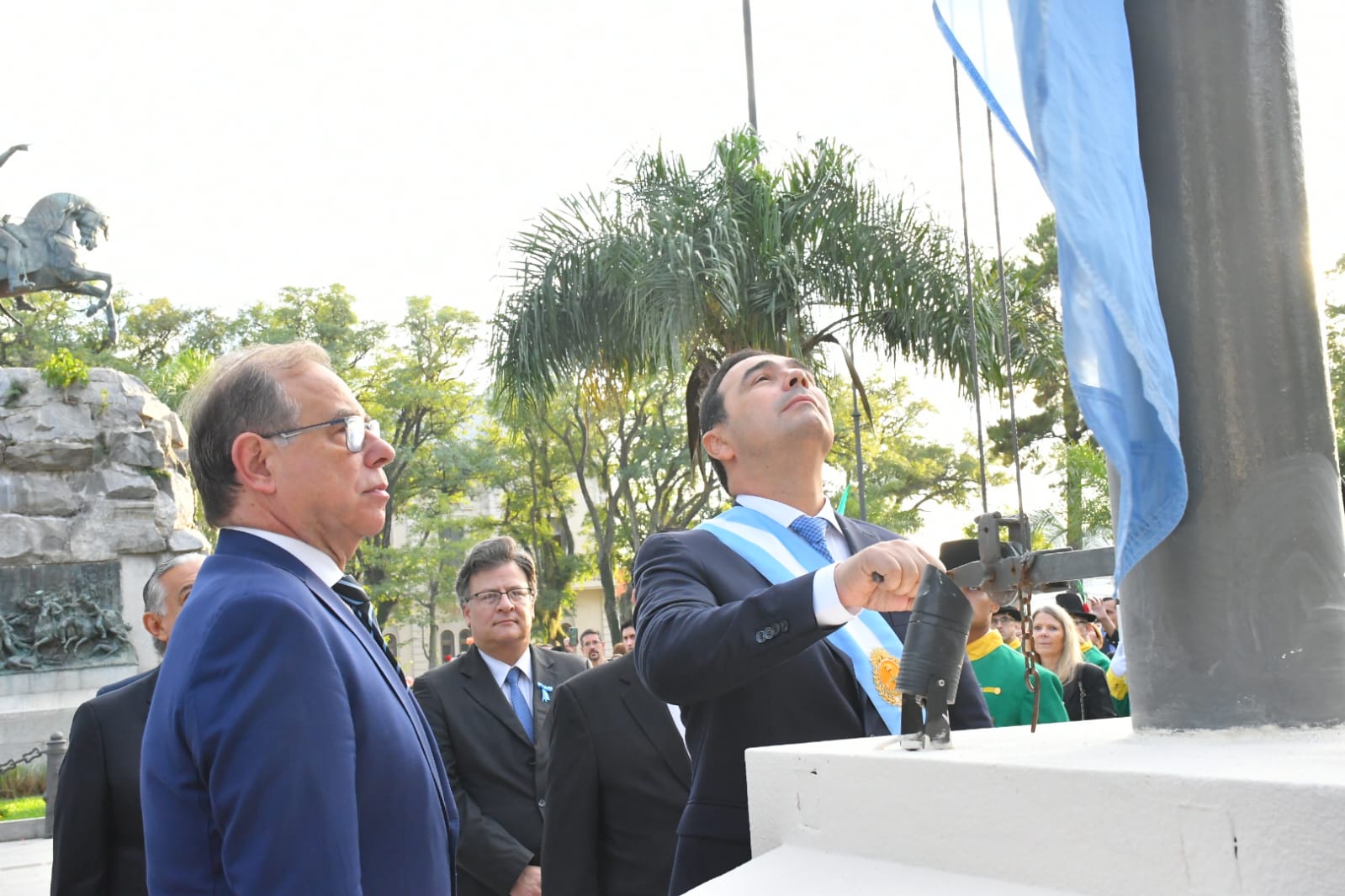 Luego, de la realización del izamiento de la enseña Patria y de la ofrenda floral al monumento del Libertador, José de San Martín en la Plaza 25 de Mayo, las autoridades ingresaron al patio de Casa de Gobierno para realizar el saludo protocolar en alusión a la fecha y continuar con la agenda.